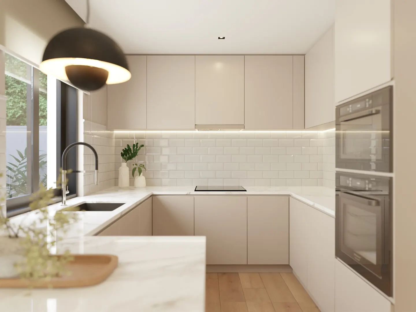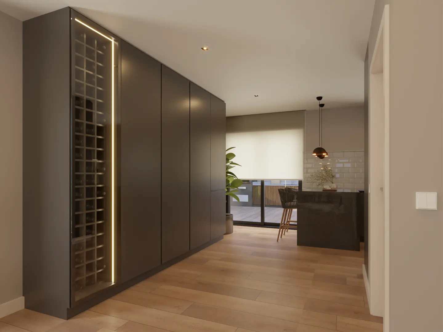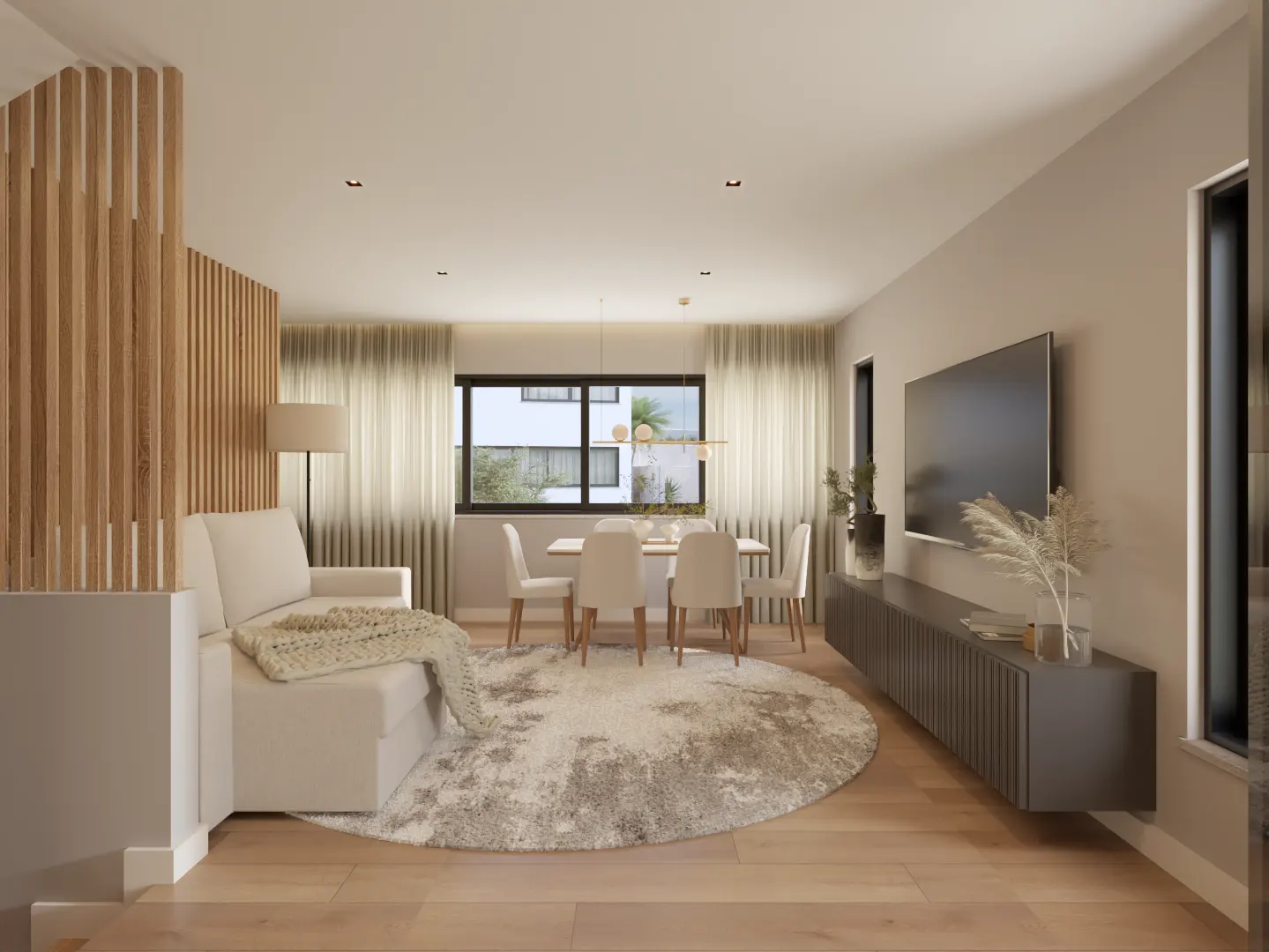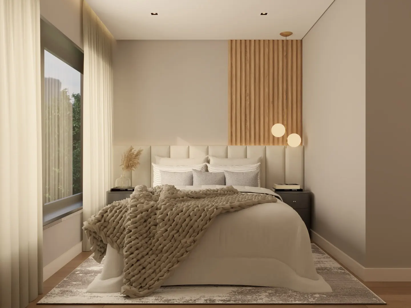 O acesso principal ocorre por um jardim lateral, que contribui para a estética, ventilação e iluminação. A área social, localizada na parte frontal, conta com sala de estar e jantar integradas, conectadas a uma cozinha em conceito aberto. Os dormitórios ficam em setor reservado, garantindo privacidade e conforto térmico. Banheiros e área de serviço são posicionados estrategicamente para otimizar a funcionalidade do espaço. Um corredor central distribui os fluxos de maneira eficiente.