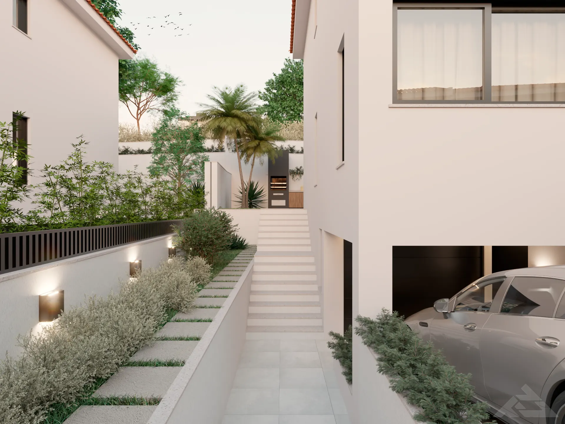 A moradia adota um design linear e funcional, aproveitando ao máximo o terreno estreito e comprido. A circulação eficiente conecta ambientes sociais e privados, valorizando a ventilação e iluminação natural, além da integração harmoniosa entre áreas internas e externas.