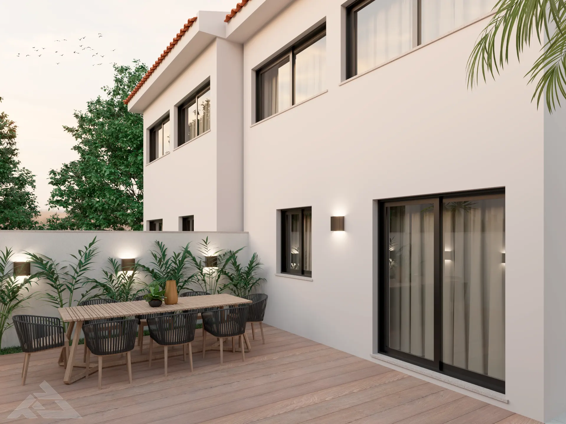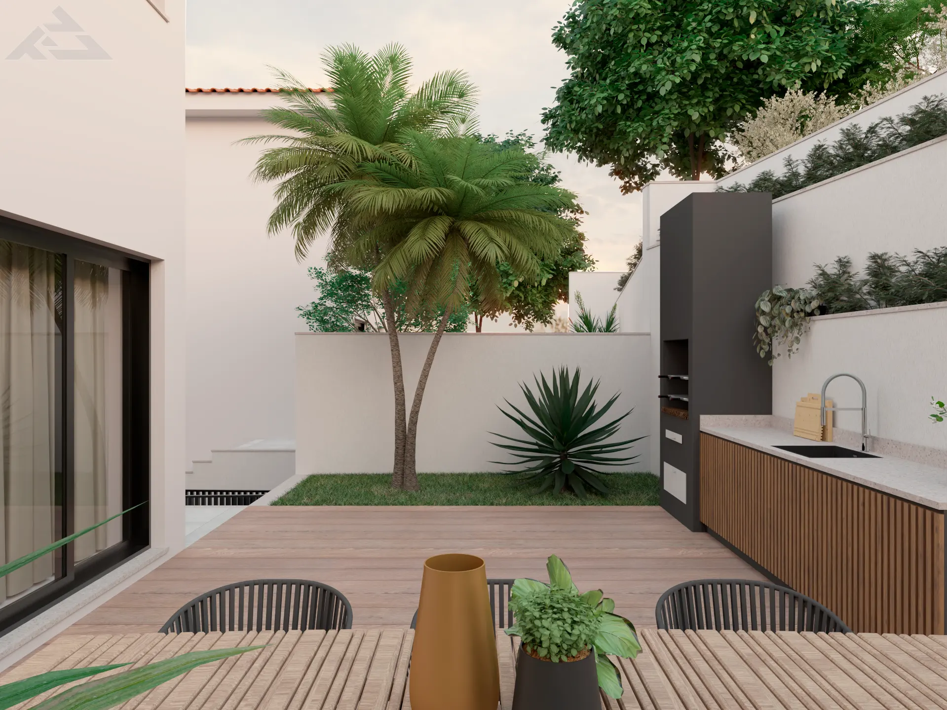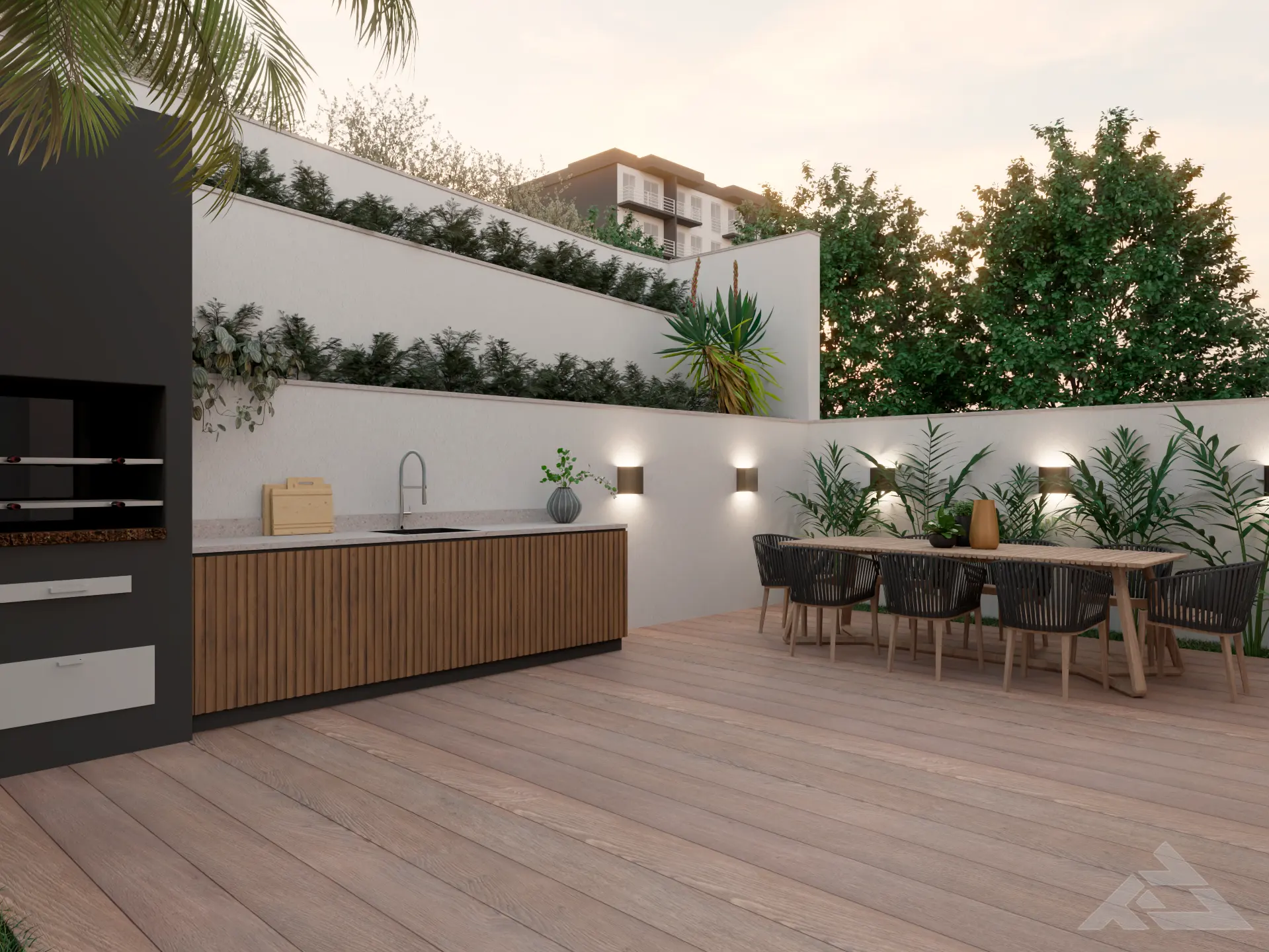 A área externa traseira funciona como uma extensão da casa, ideal para lazer, enquanto o deck com mobiliário ao ar livre reforça a conexão com a natureza. O jardim nas laterais e ao fundo melhora o conforto ambiental, proporcionando ventilação cruzada e sombreamento natural.
